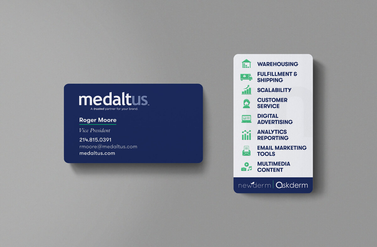 For their business card, we ended up with three final options to meet different needs in providing more or less information to potential partners. A set of eight custom icons were created to quickly communicate the primary services medaltus offers.